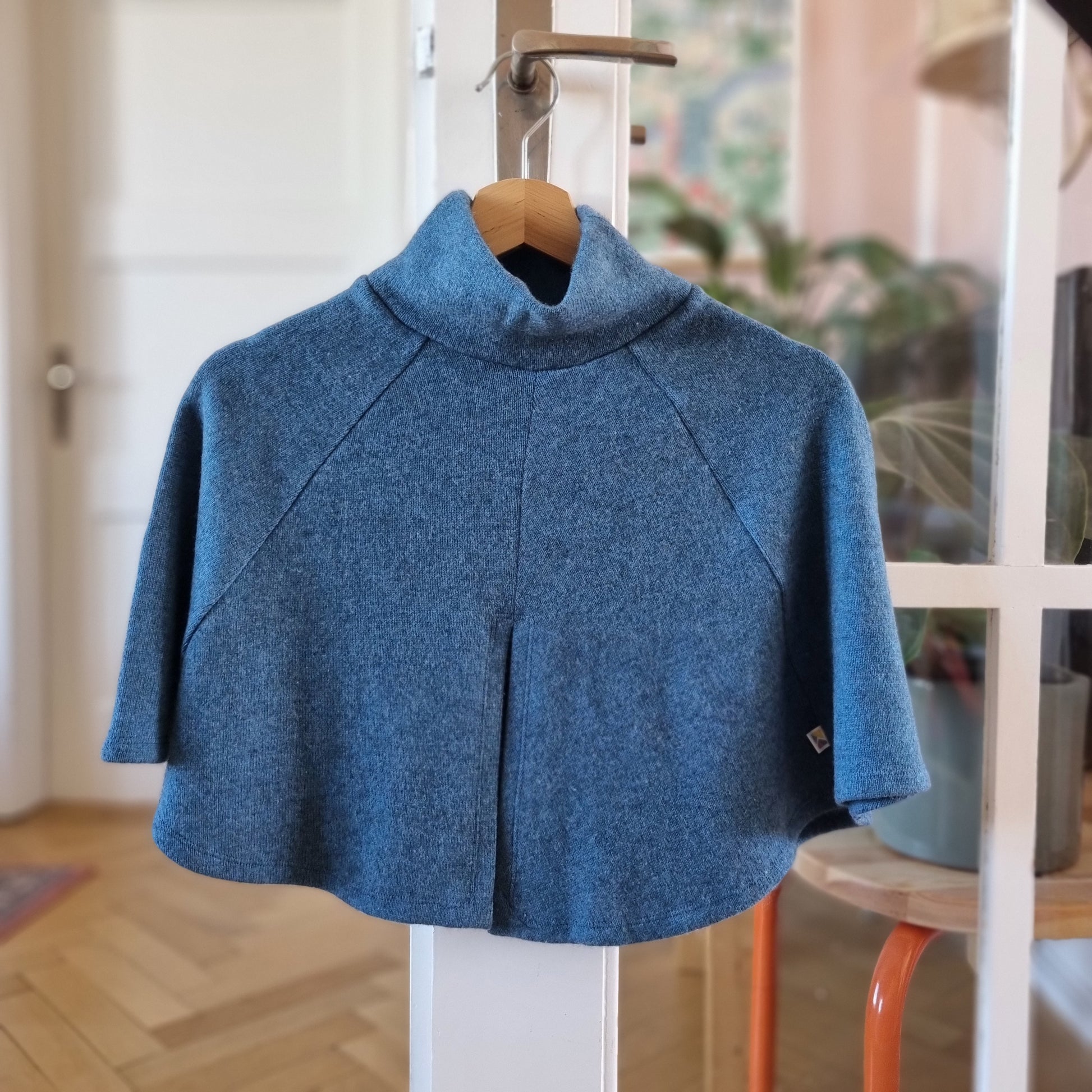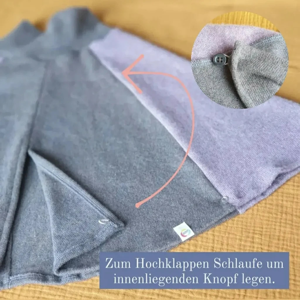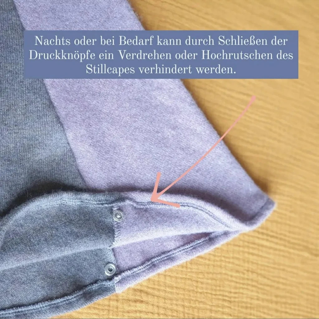 Das Stillcape kann mit Hilfe eines innenliegenden Knopfes über jeder Brust individuell hochgeklappt werden. Durch Druckknöpfe zwischen den Armen wird das Hochrutschen und Verdrehen des Capes verhindert.